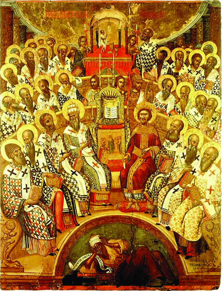 The Council of Nicaea, held in 325 AD, was attended by Emperor Constantine and ended with the defeat of the Arian heresy. Arius is represented at the feet of the assembly