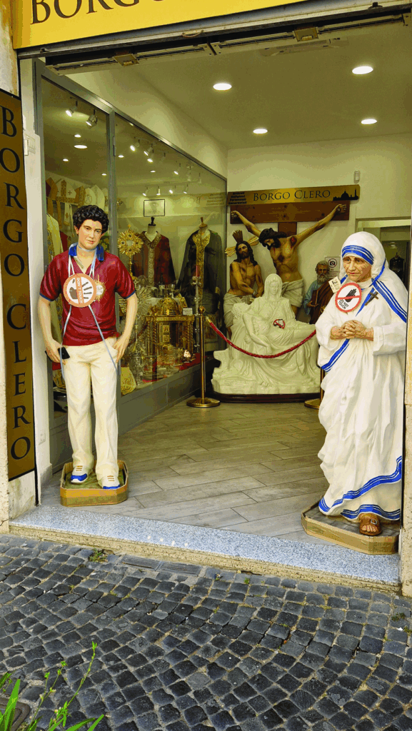 A statue of Blessed Carlo Acutis next to that of St. Mother Teresa of Calcutta in a religious goods shop in Rome (Photo Paolo Fucili)