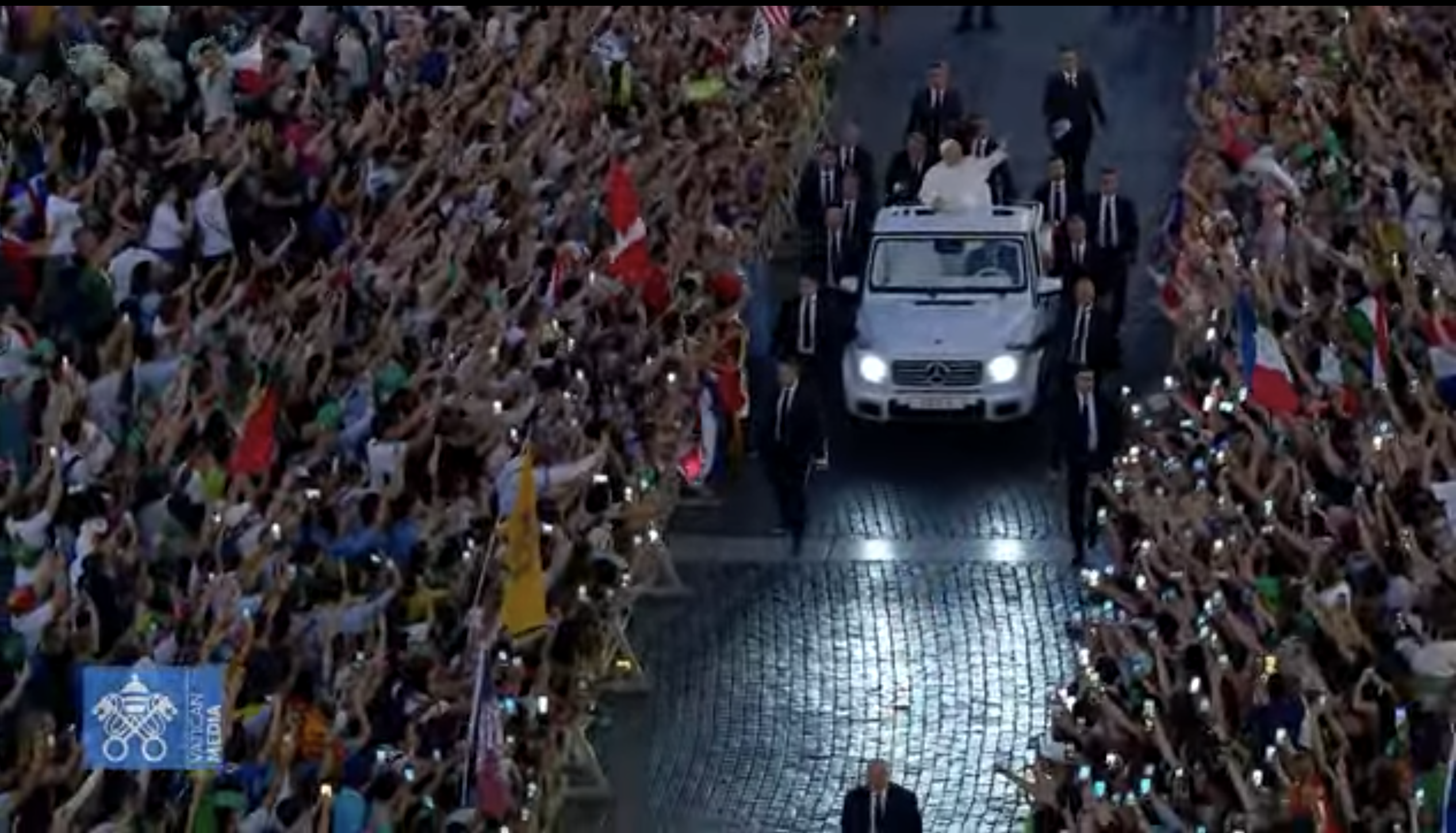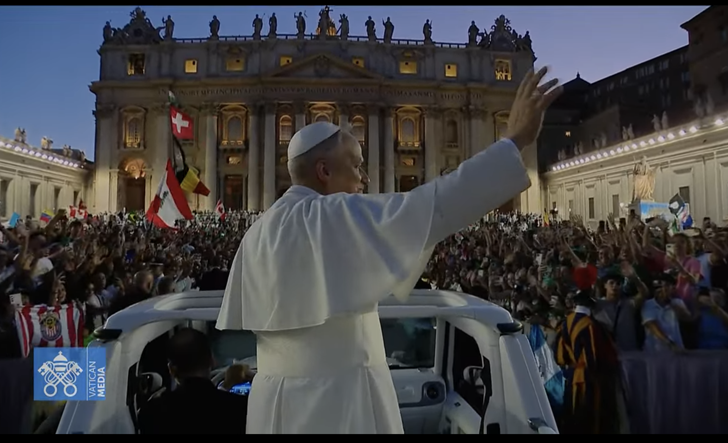 As evening starts to fall, Pope Leo in his popemobile makes his way through the crowds of young people in the piazza. The lights of the popemobile are turned on…